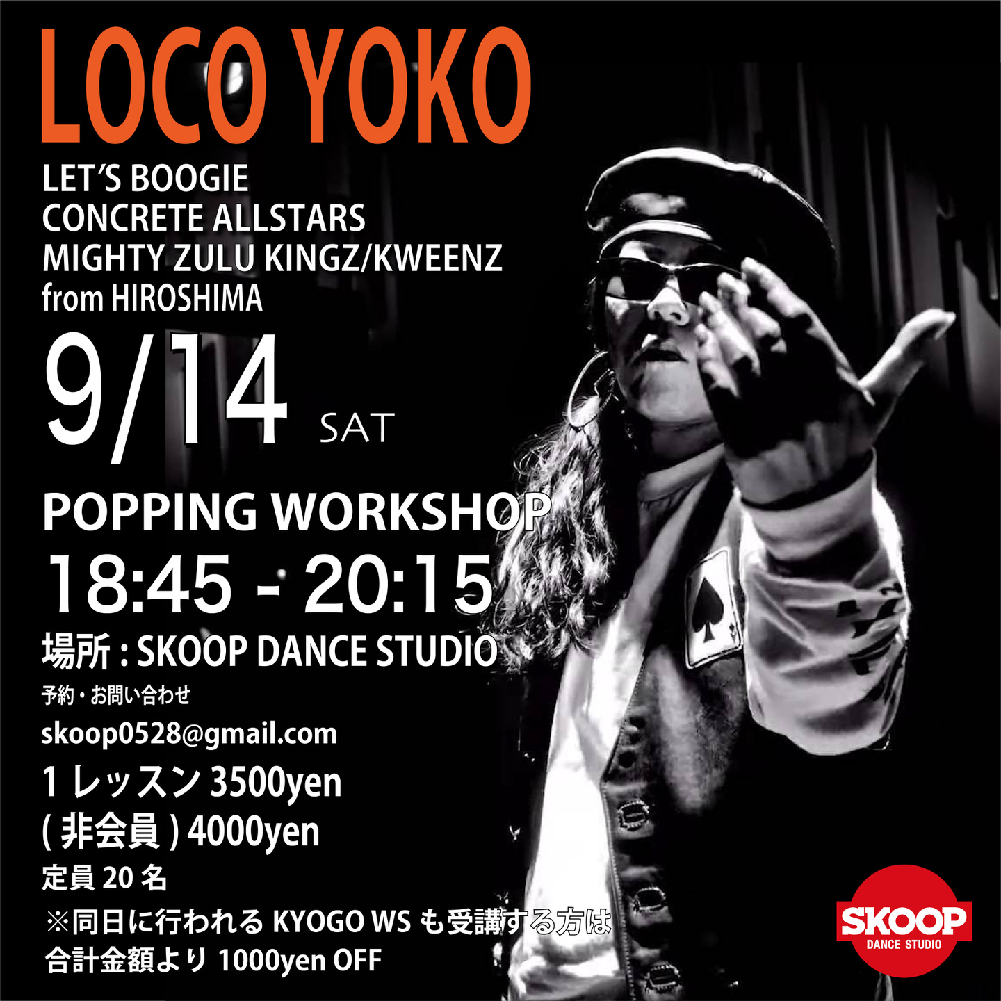 【LOCO YOKO SPECIAL POPPING WS】 日時 2024年9月14日(土)/場所 SKOOP DANCE STUDIO /時間 18:45-20:15 /1レッスン4000円 ( SKOOP会員の方は1レッスン3500円 )